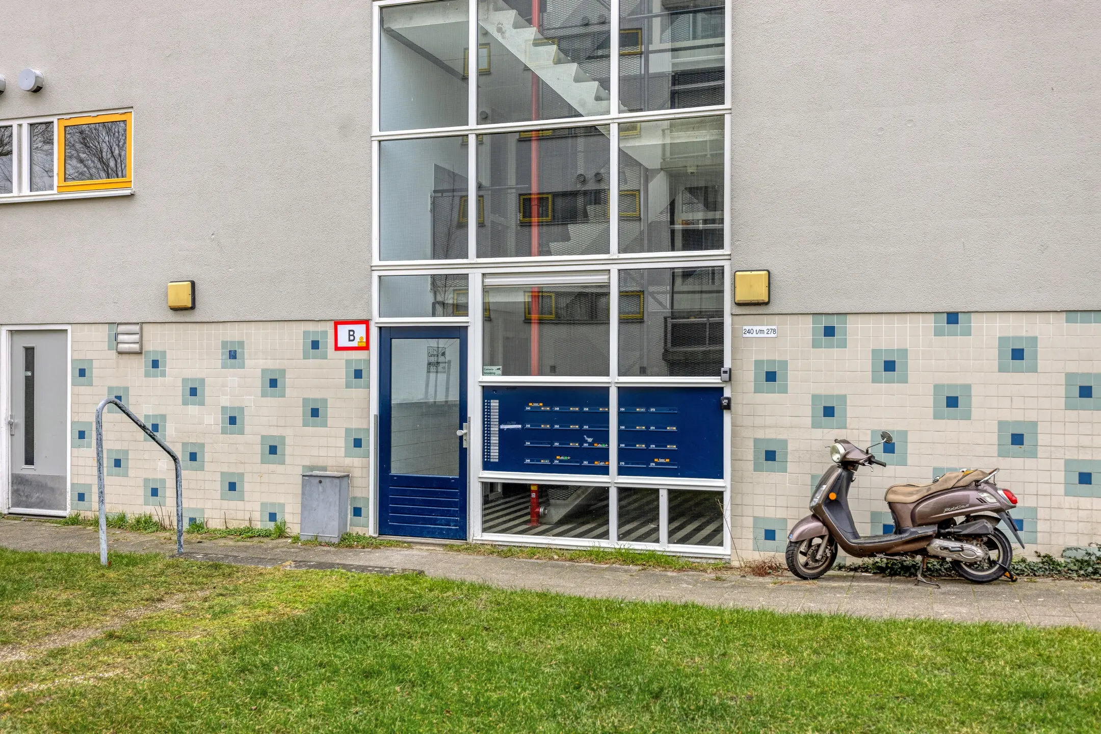 Centrale entree met brievenbussen, trapopgang, lift en toegang tot de eigen (ruime) berging.