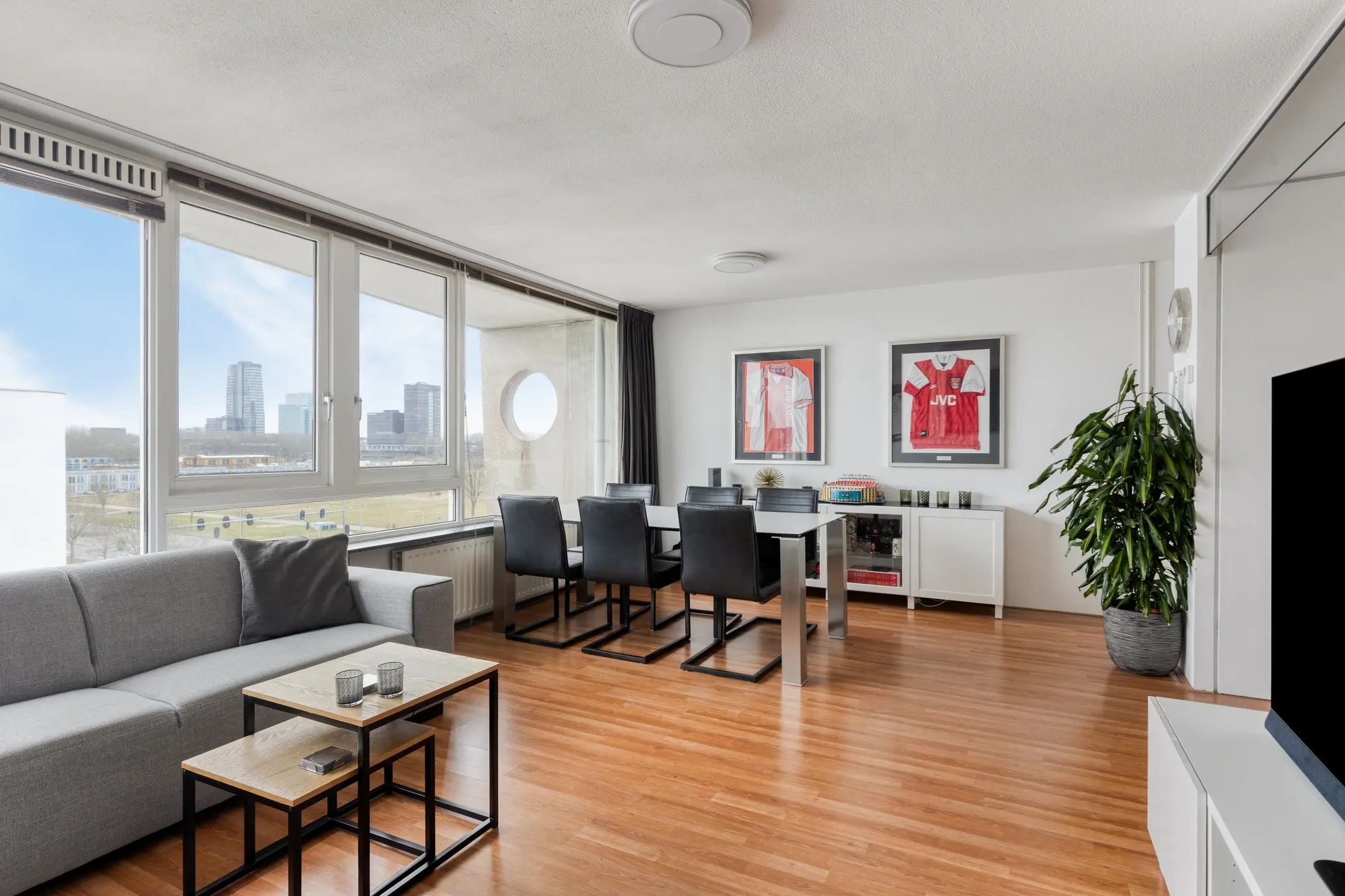 Hier bevindt zich de ruime woonkamer over de volledige breedte van de woning. Dankzij de grote raampartijen is er veel natuurlijke lichtinval.