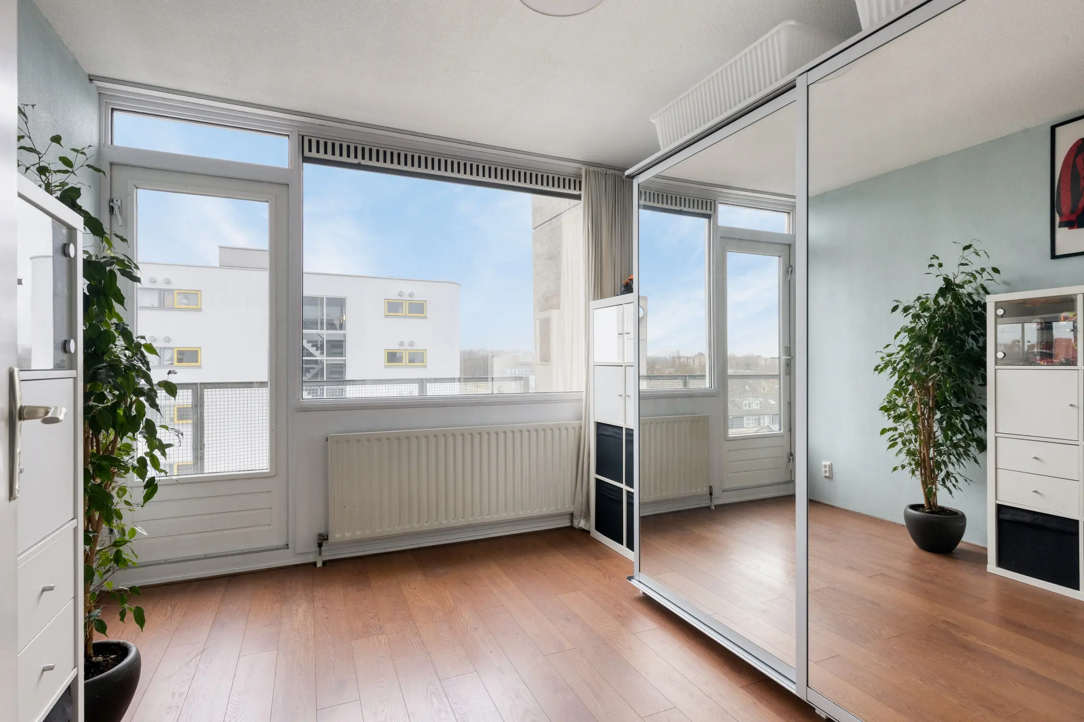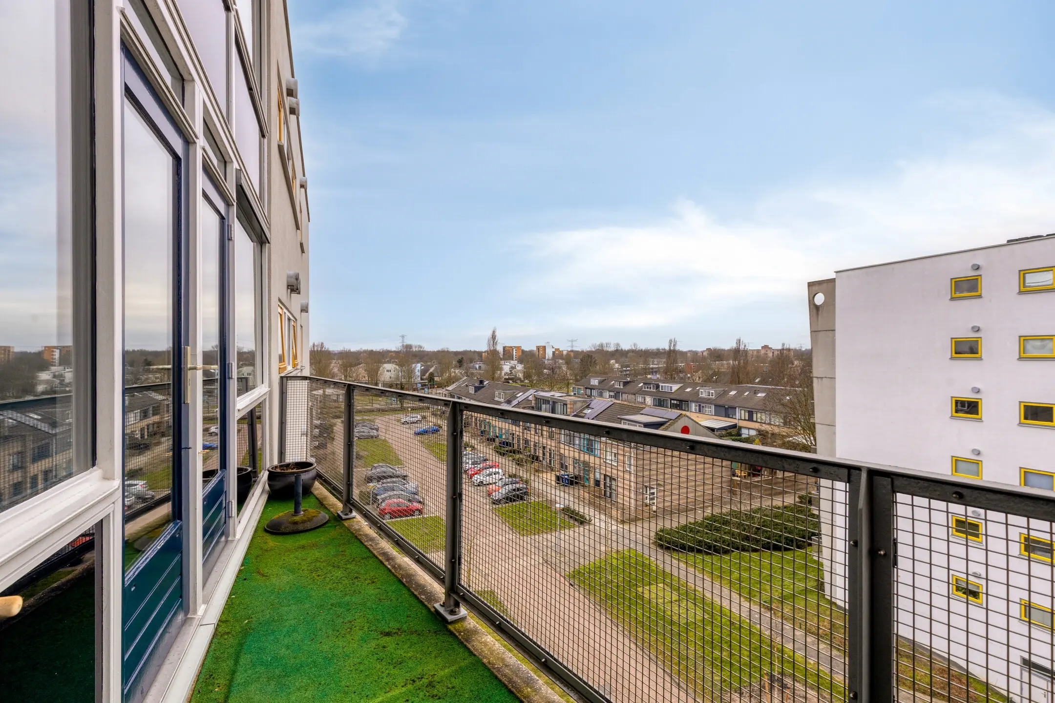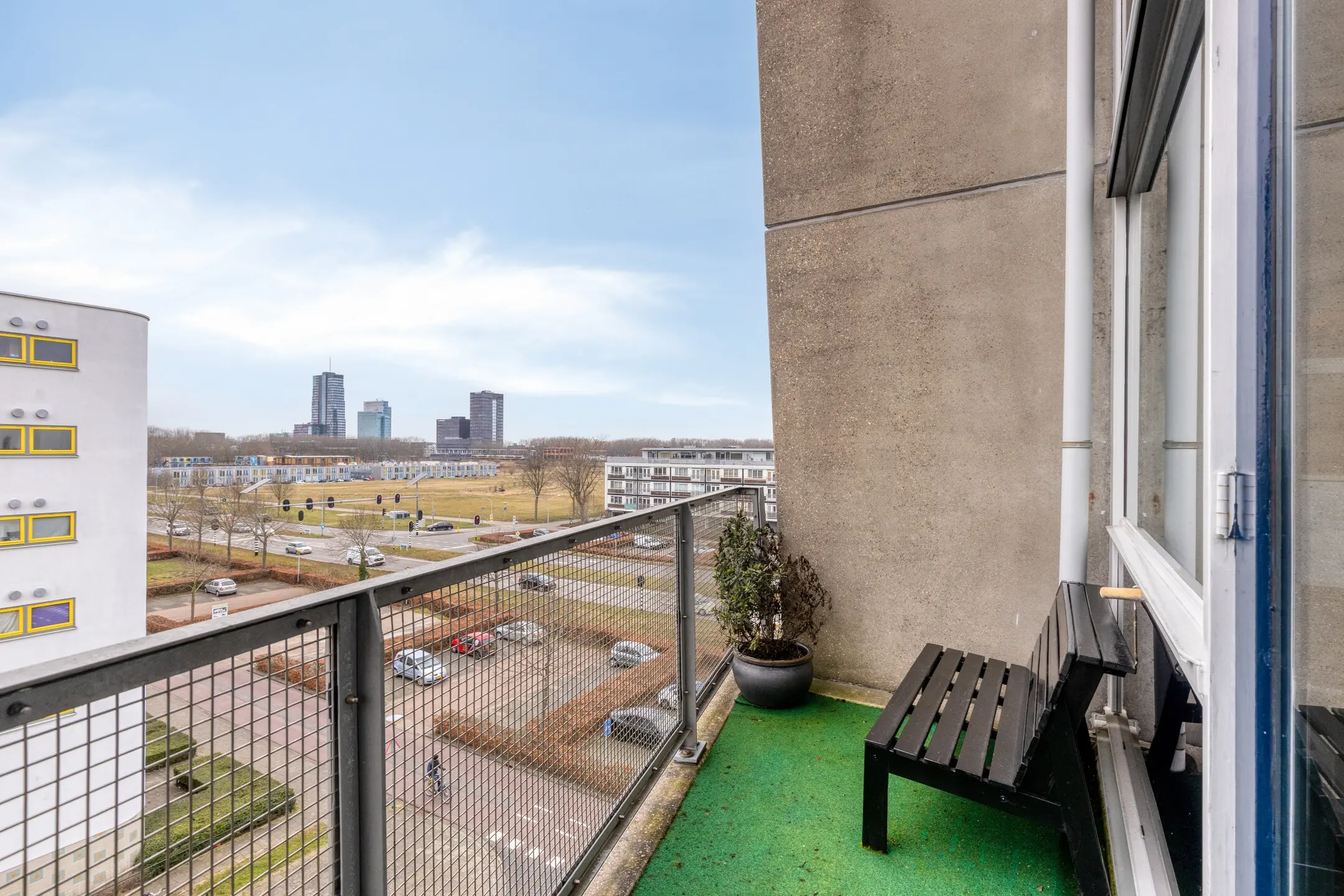 Het balkon, gelegen op het zuidwesten, is bereikbaar vanuit beide slaapkamers.