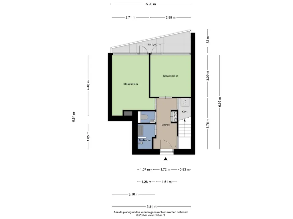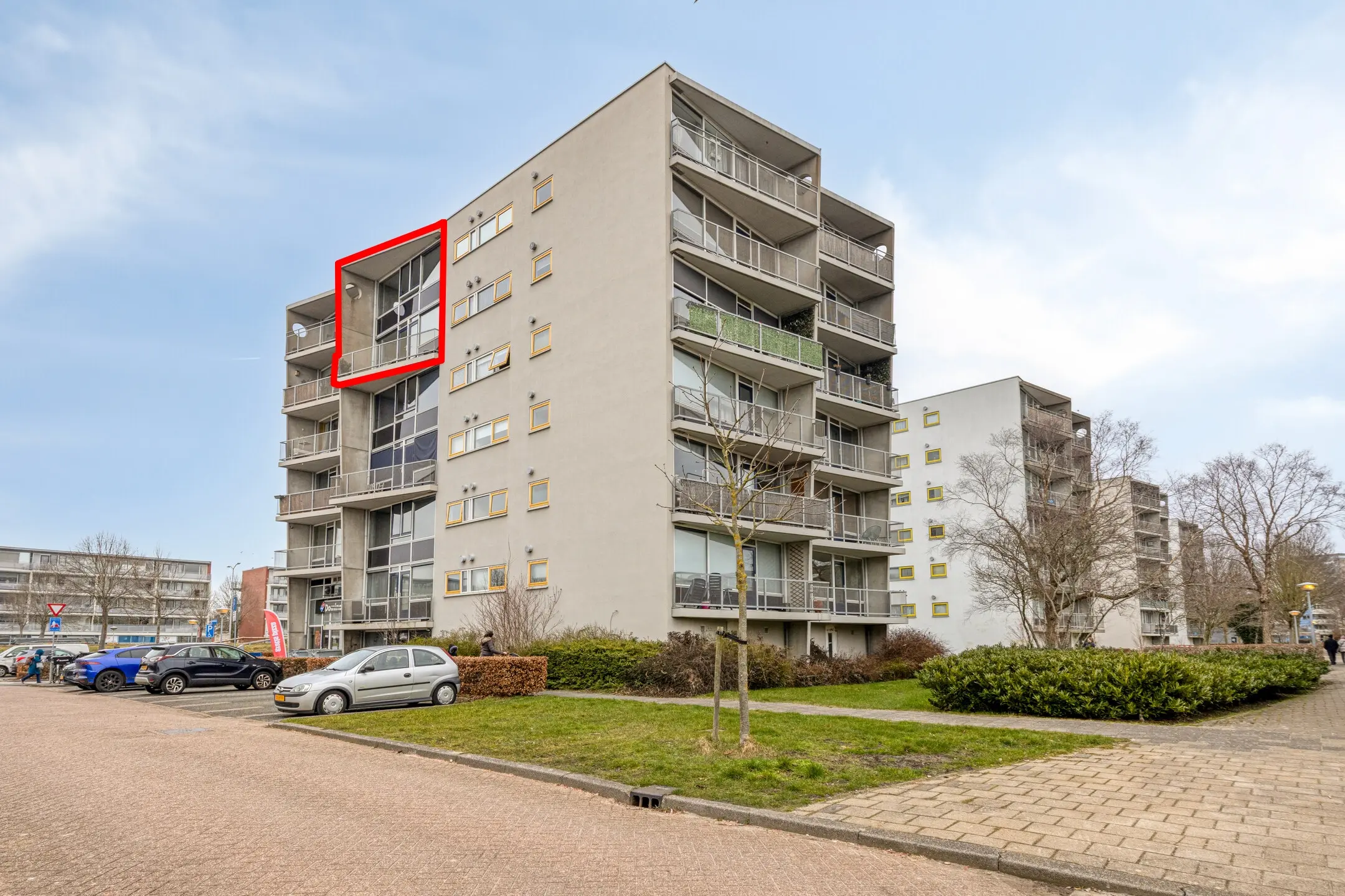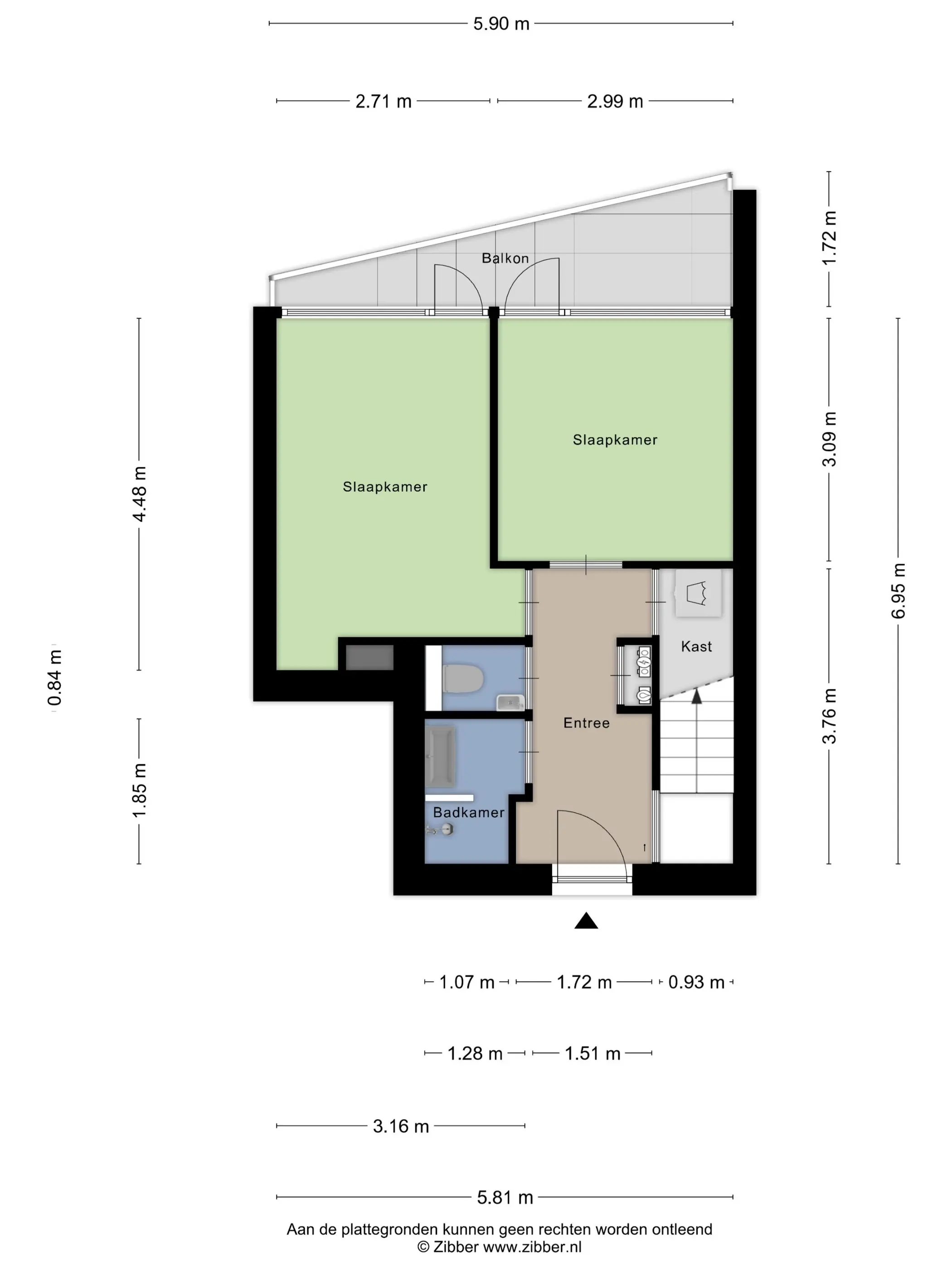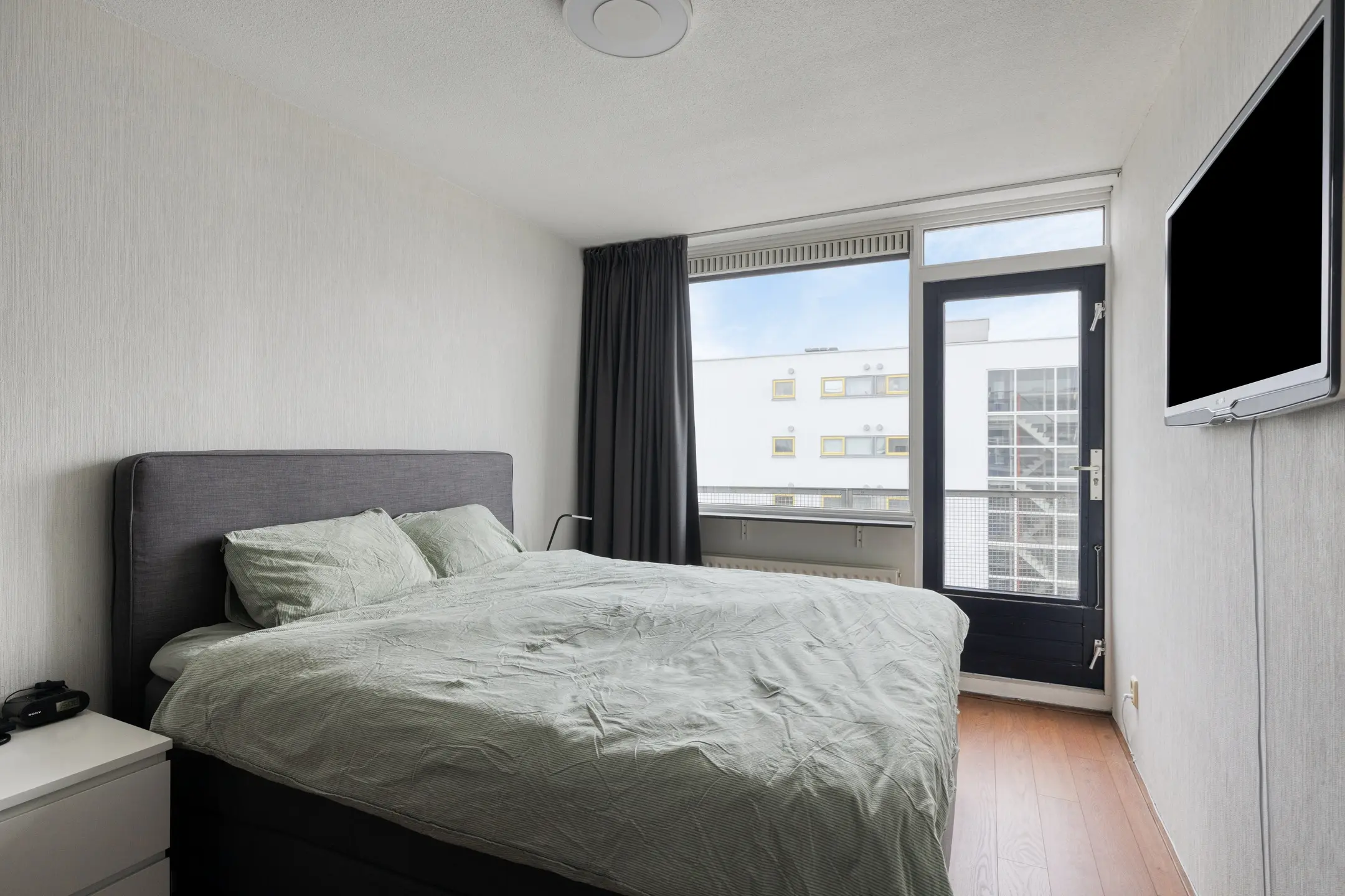 Het balkon, gelegen op het zuidwesten, is bereikbaar vanuit beide slaapkamers.