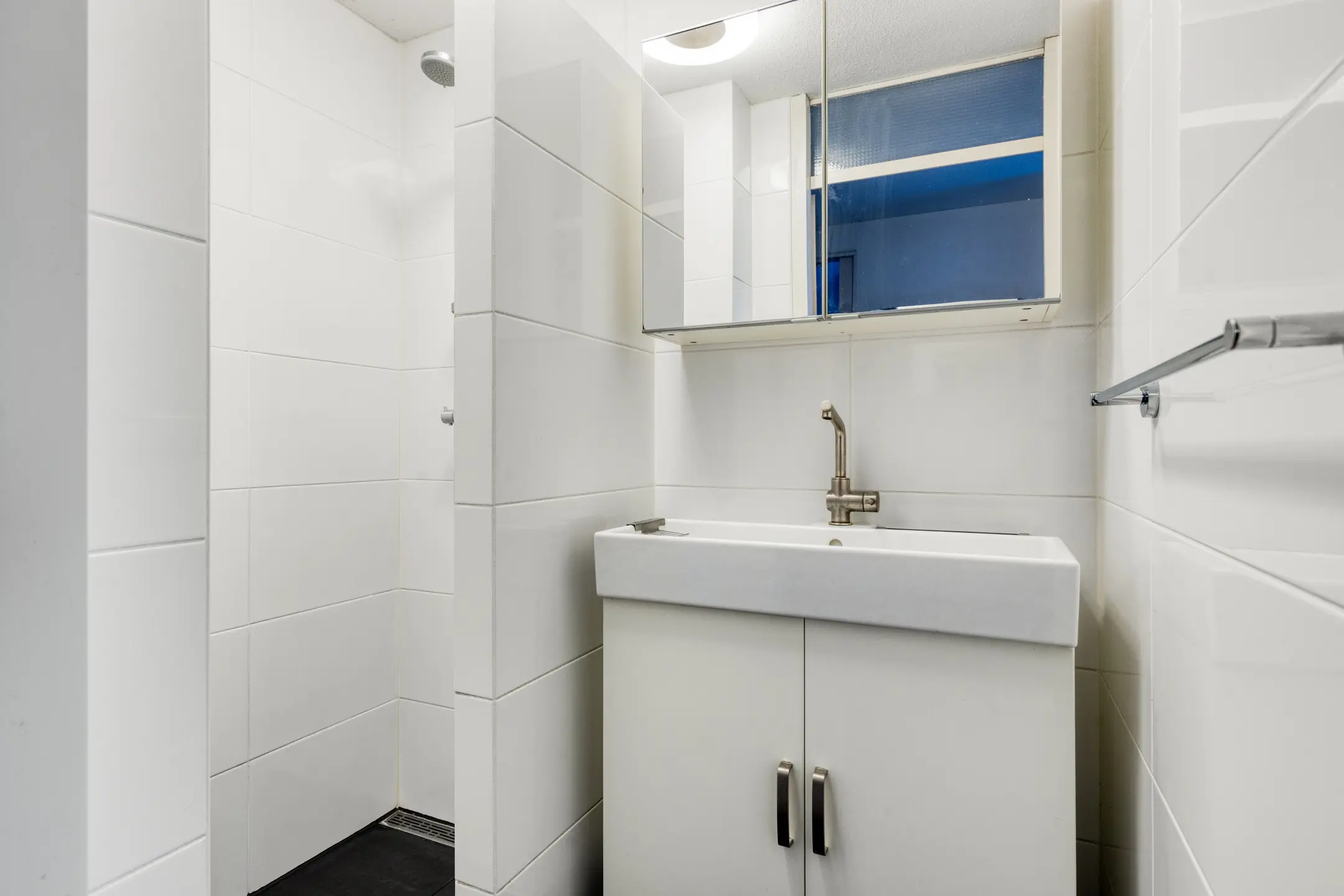 De badkamer is voorzien van een douche en wastafel.